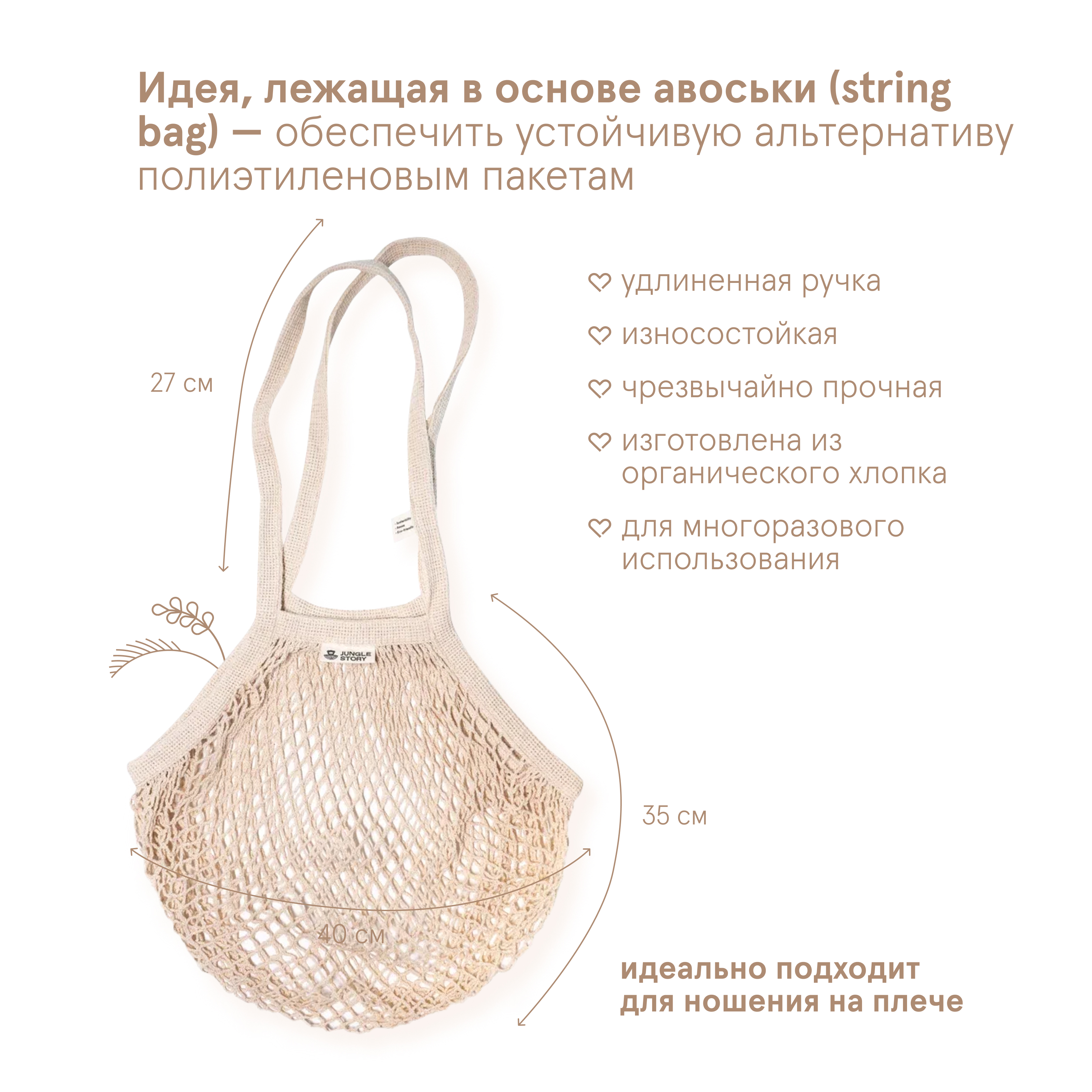 Эта сумка плетеная и имеет форму привычной авоськи, которая пользовалась большой популярностью в СССР. Но в отличие от традиционной авоськи, наша сумка имеет длинные ручки, что делает ее более удобной в использовании. Не натирает плечи и не спадает.