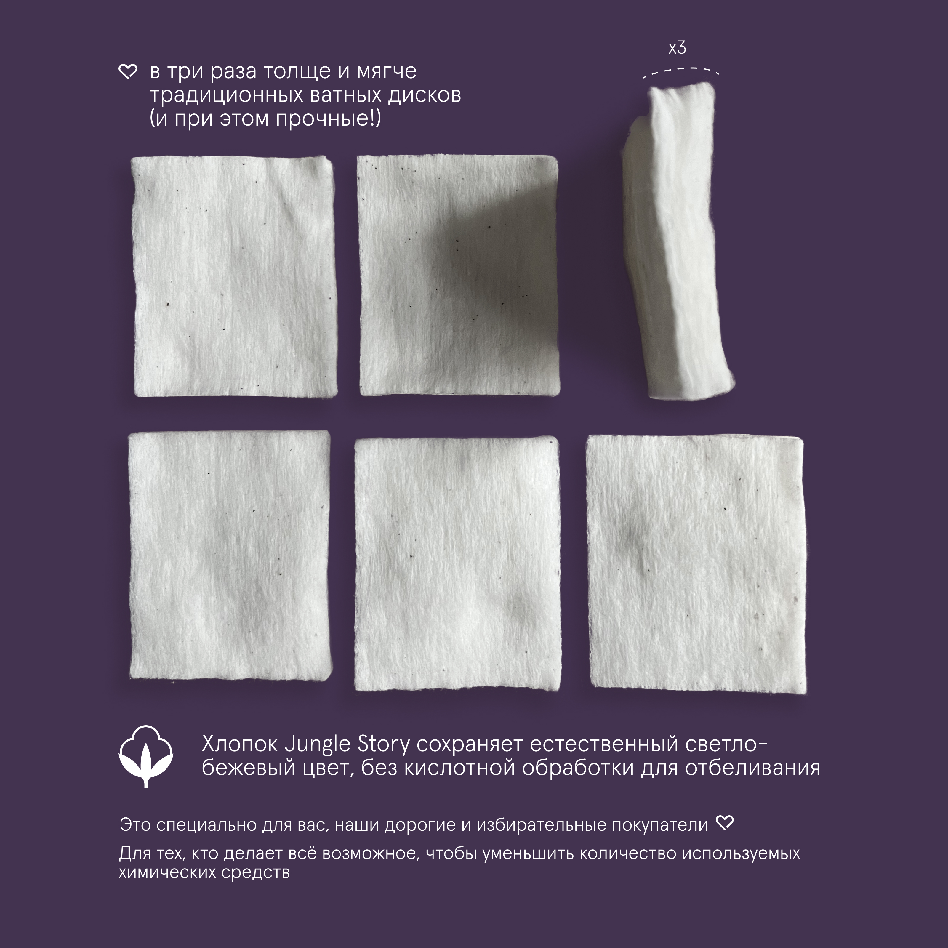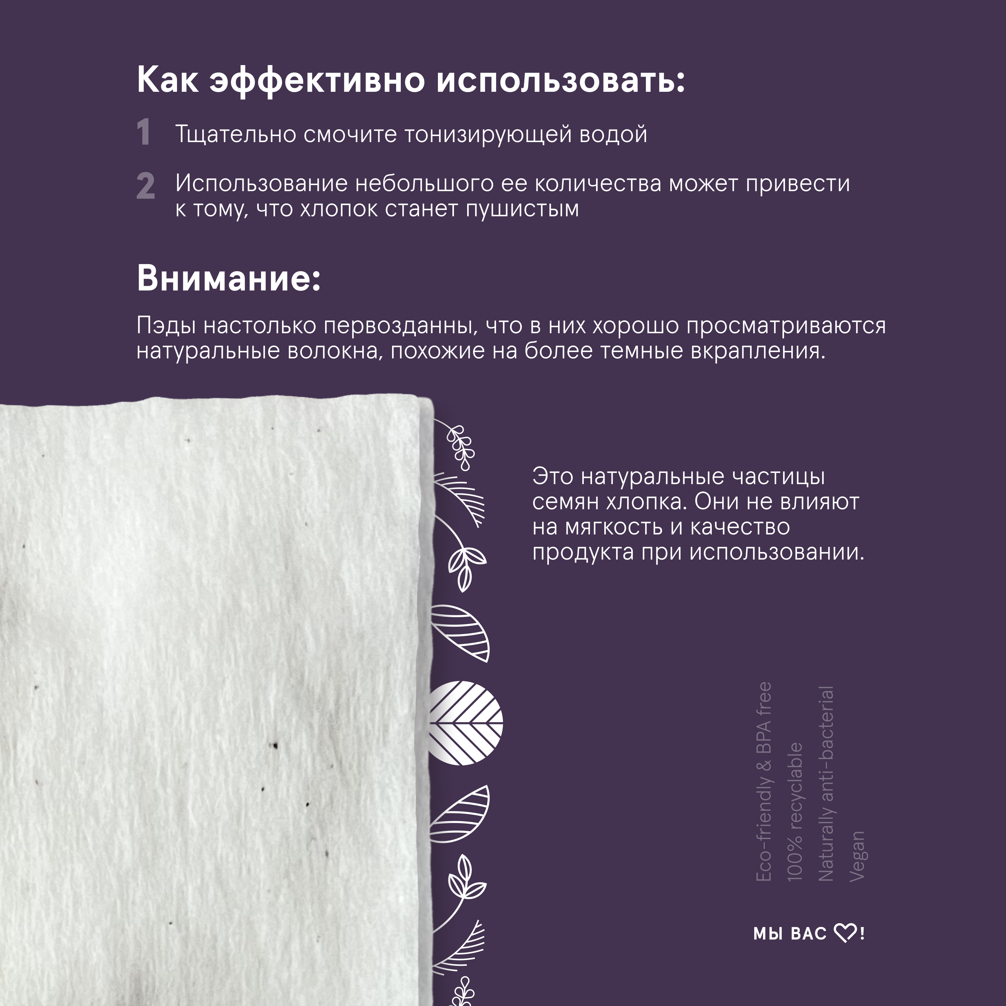 Высокая плотность волокон обеспечивает тщательный уход и очищение кожи без ворсинок. Увеличенный размер ватных подушечек позволяет с комфортом использовать их при нанесении или удалении макияжа, тонера, пудры и средства для снятия лака. Идеально подходят для чувствительной кожи. Не вызывают раздражения и аллергии.