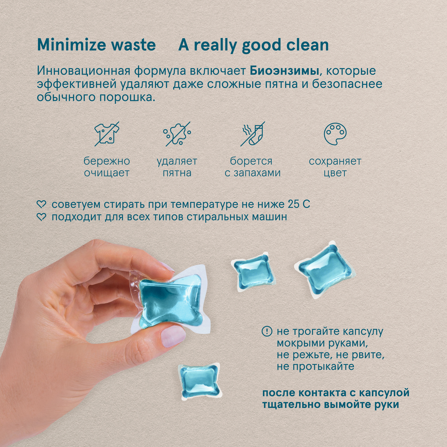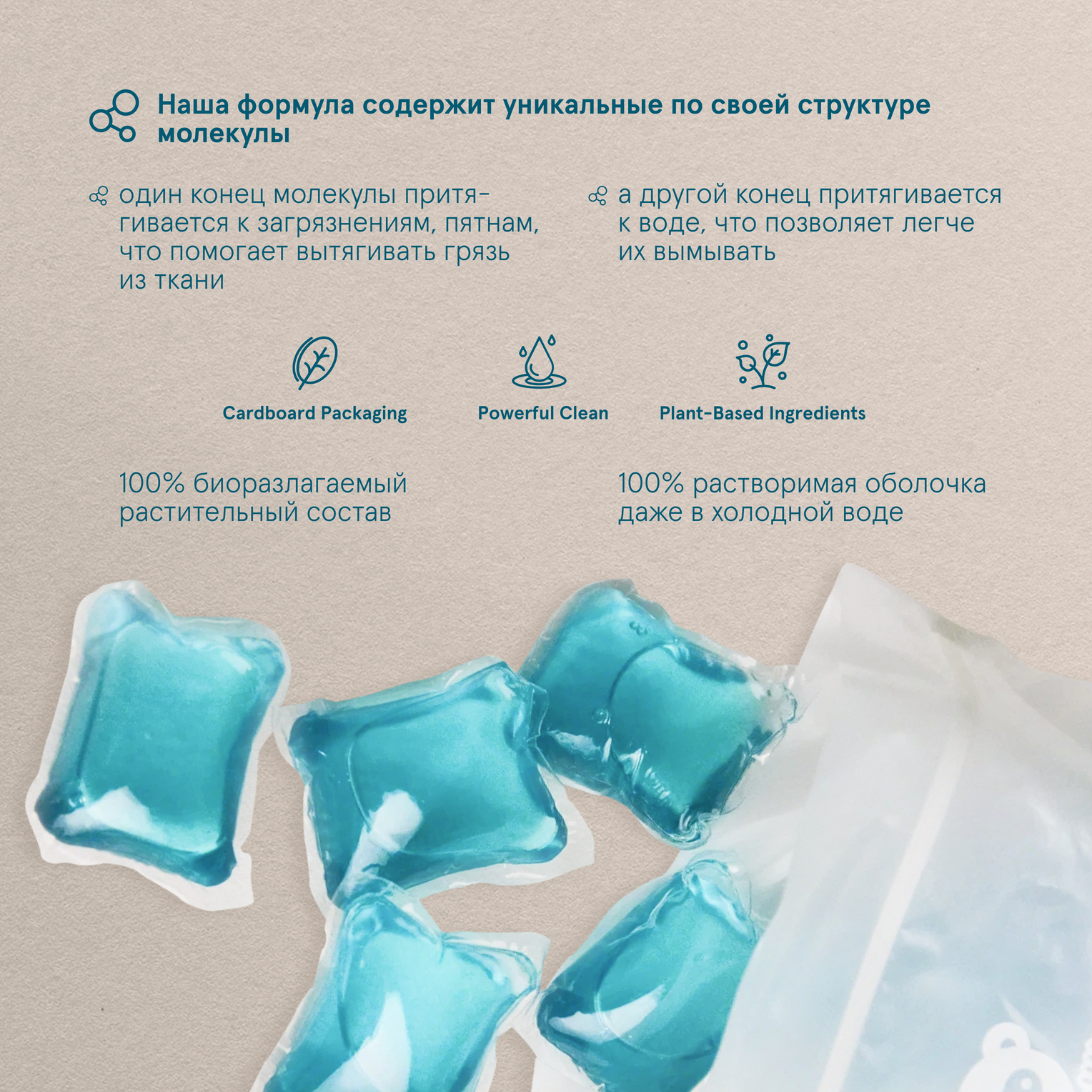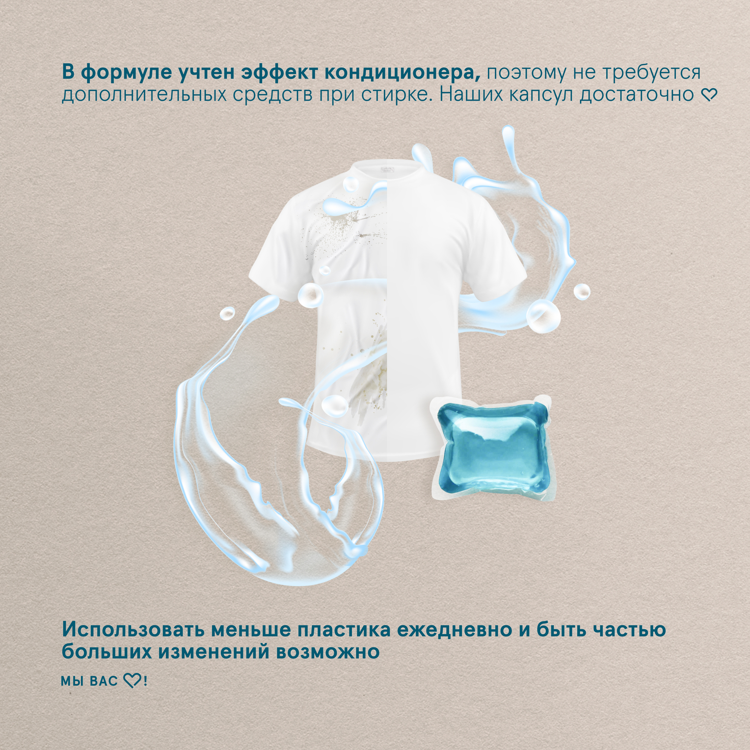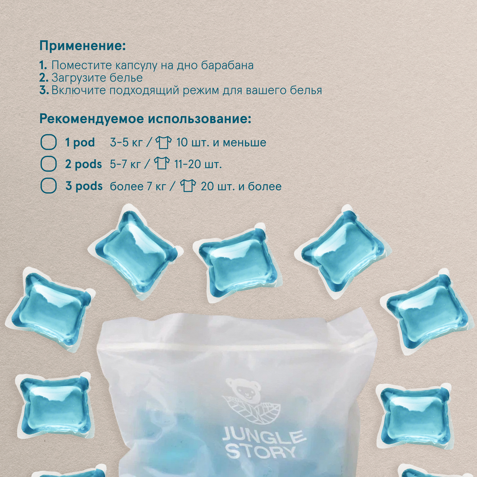 Minimize waste Компактная, биоразлагаемая упаковка, внутри капсулы с мощной силой природы. Сокращают экологичный след от этапа производства до транспортировки. Небольшие изменения в размере и весе продукции приводят к снижению выбросов углерода. А really good clean Инновационная формула включает Биоэнзимы, которые эффективней удаляют даже сложные пятна и безопаснее обычного порошка. Мы используем смесь ферментов, которые нацелены на удаление молекул одного типа, таких как белки или крахмал, в том числе протеазу (поиск белка) и липазу (поиск жира) в нашем моющем средстве для достижения наилучших результатов. Наша формула содержит уникальные по своей структуре молекулы, один конец молекулы притягивается к загрязнениям, пятнам, что помогает вытягивать грязь из ткани, а другой конец притягивается к воде, что позволяет легче их вымывать.Нежное и сильное эка-моющее средство, которое действительно работает • Дополнительная мягкость • Защита от накипи • Сохраняет форму, структуру и цвет тканей • Антибактериальный эффект • Для цветного и белого белья• Не содержит синтетические красители, отдушки, оптические отбеливатели, агрессивные ПАВ, PPG, SLS, ЭДТАНе трогайте капсулу мокрыми руками, не режьте, не рвите, не протыкайте. После контакта с капсулой тщательно вымойте руки.100% Биоразлаrаемый растительный состав 100% растворимая оболочка даже в холодной воде• Советуем стирать при температуре не ниже 25"С • Подходит для всех типов стиральных машинПрименение: 1. Поместите капсулу на дно барабана2. Загрузите белье3. Включите подходящий режим для вашего бельяJungle Story Мы специализируемся на качественной продукции, выполняющей в первую очередь эффективно свои функции в повседневных привычках, при этом минимизируя экологичный след и которые влияют на здоровье людей. Наша миссия заключается в создании устойчивой и здоровой среды путем предоставления пользователям широкого ассортимента эко продукции высокого качества. Мы считаем, что сейчас самое время изменить ситуацию Мы за осознанность. И нам не все равно, что будет с нашей планетой и здоровьем.