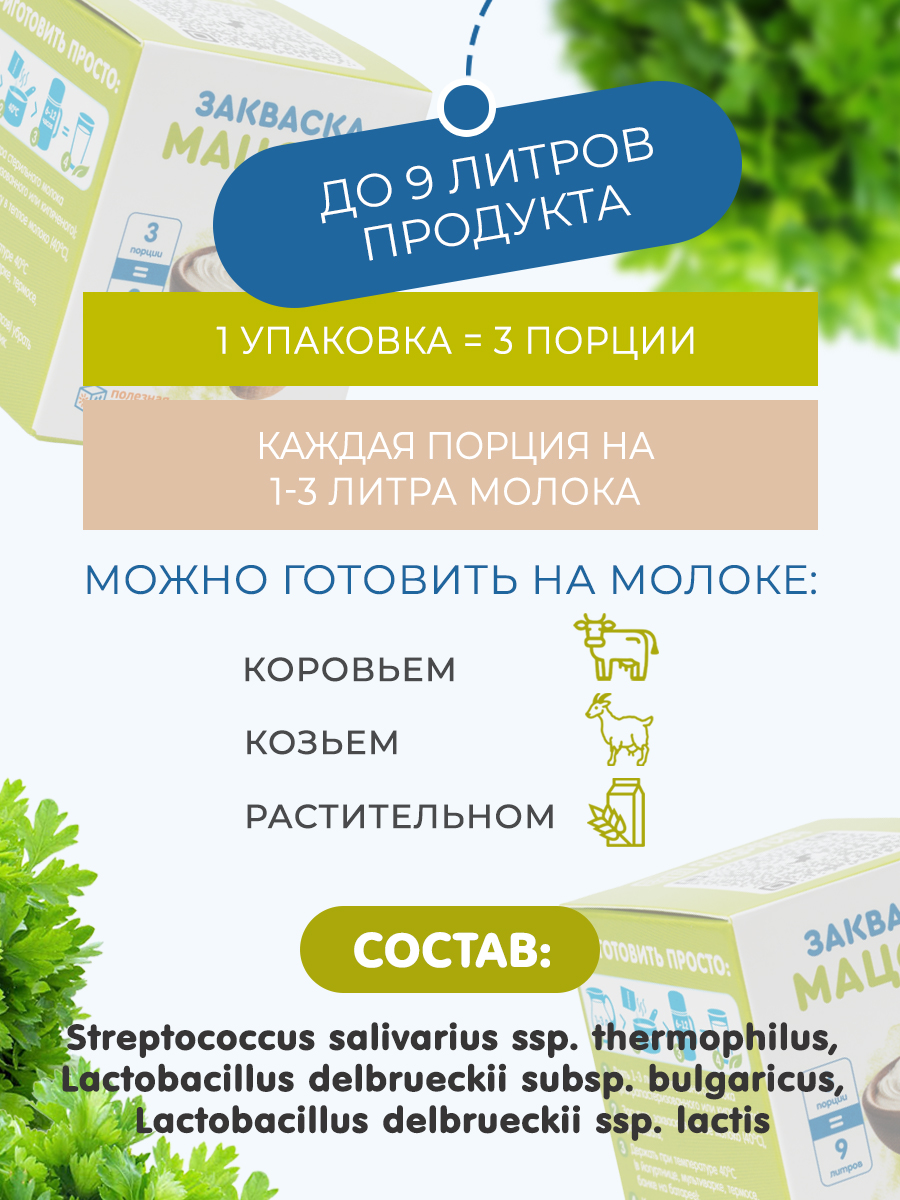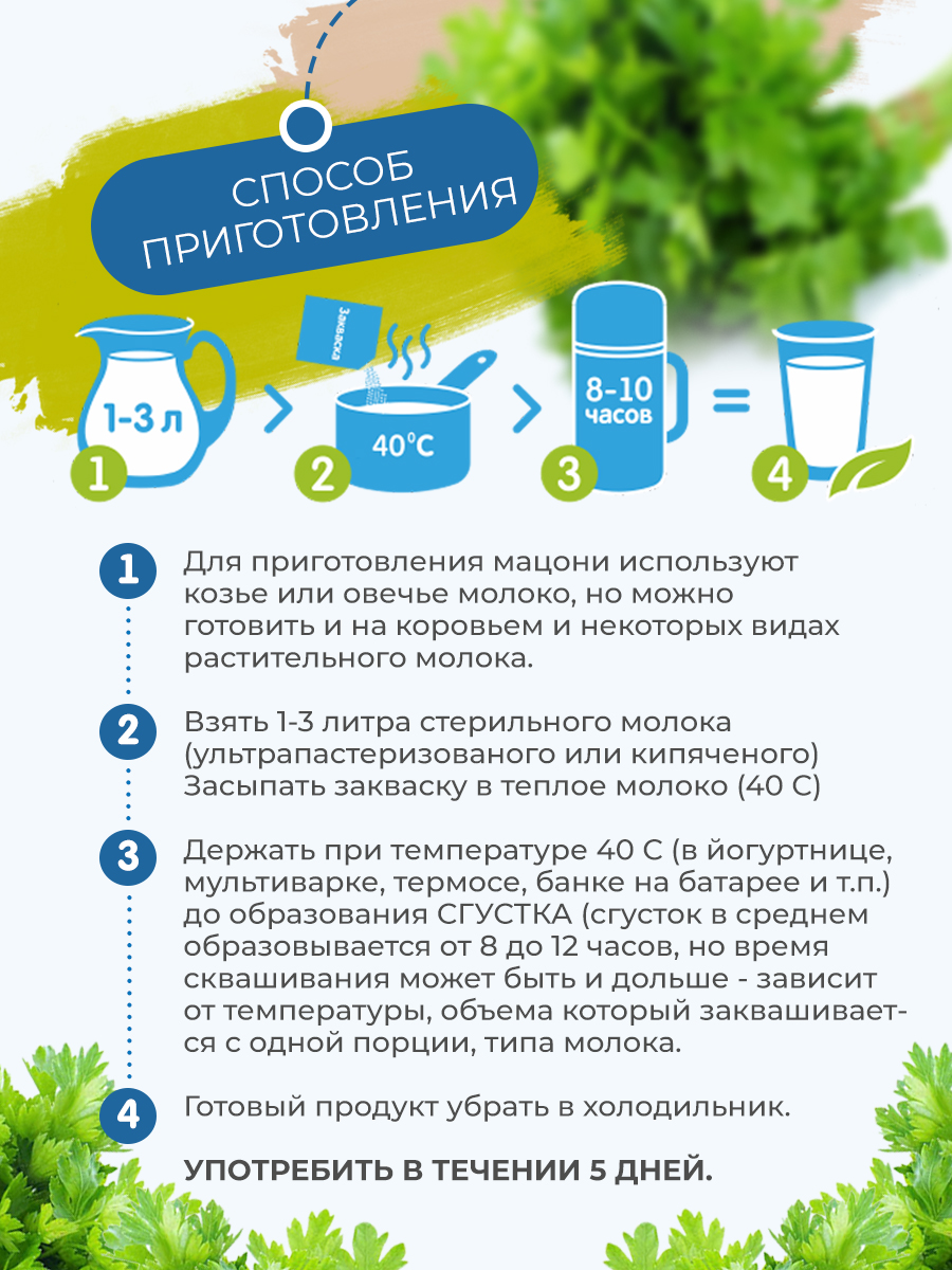 Домашние продукты на заквасках — это отличный завтрак и перекус для всей семьи. Готовить его легко, в этом поможет подробная инструкция на упаковке. 1 стик может заквасить до 3х литров молока.